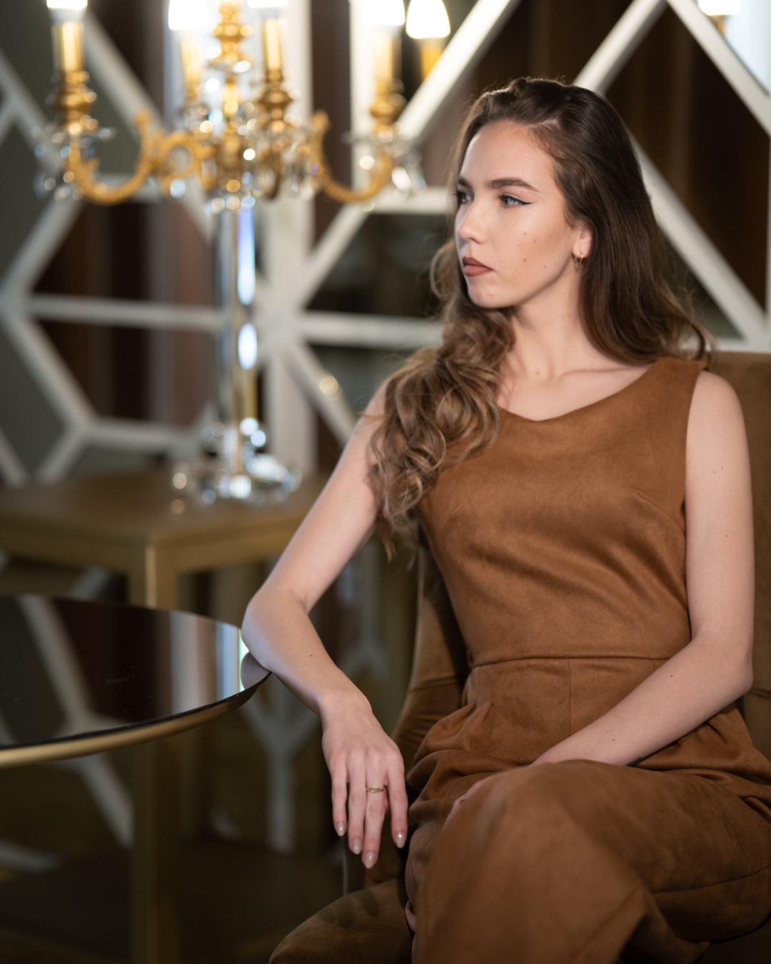 Salopetă în stil elegant-lejer, realizat din țesătură cu aspect de piele întoarsă.