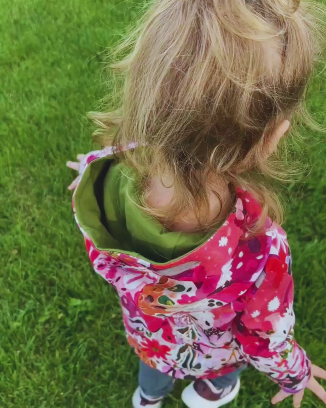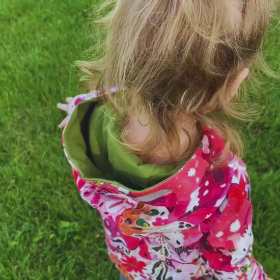 Modelul are o croială lejeră, cu glugă practică și imprimeu floral plin de culoare, perfect pentru joacă și zilele pline de aventură.