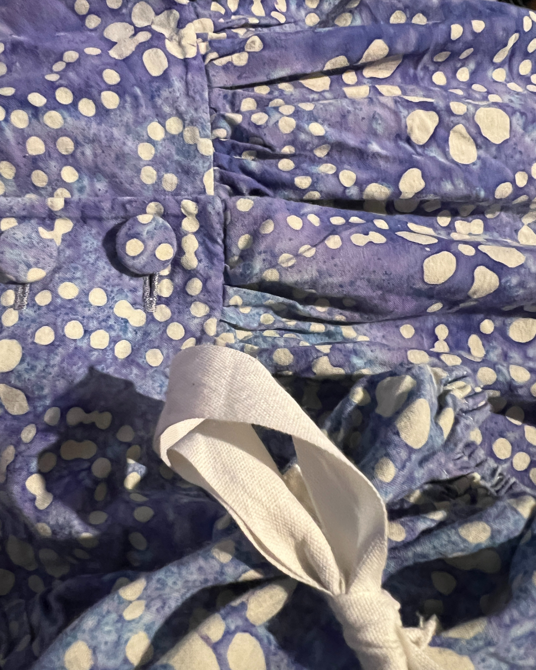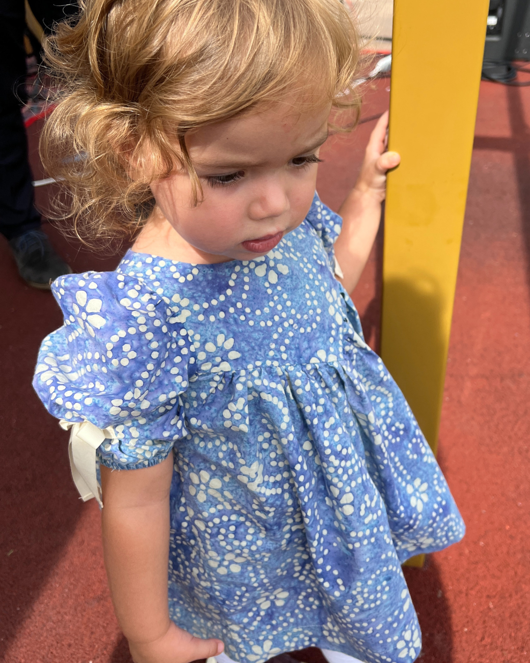 Rochiță delicată din poplin de bumbac, cu imprimeu floral în nuanțe de albastru și alb, inspirat de gingășia florii de lăcrămioare. Croiala amplă, cu falduri fine și mâneci bufante, oferă libertate de mișcare și un aer romantic.