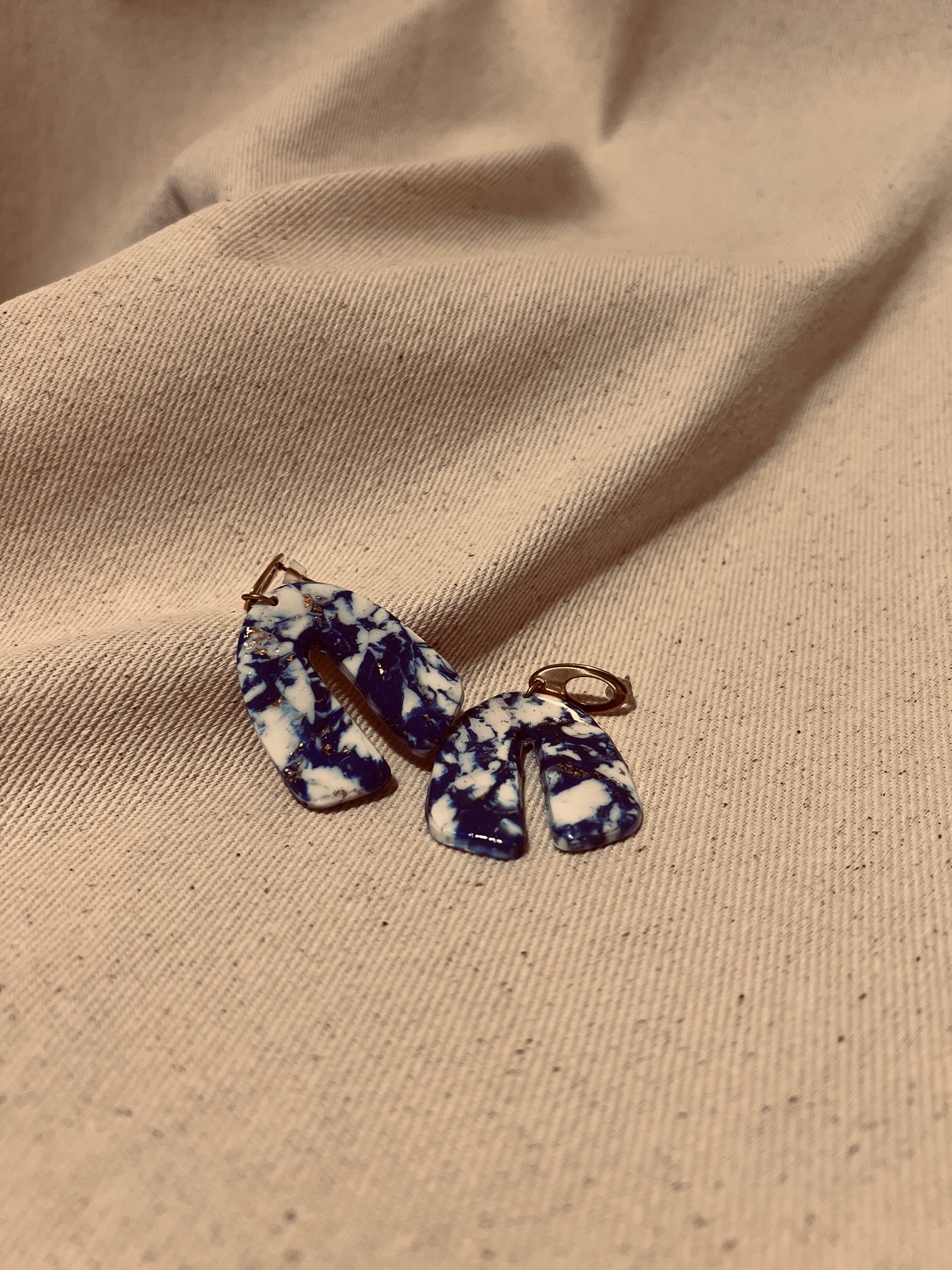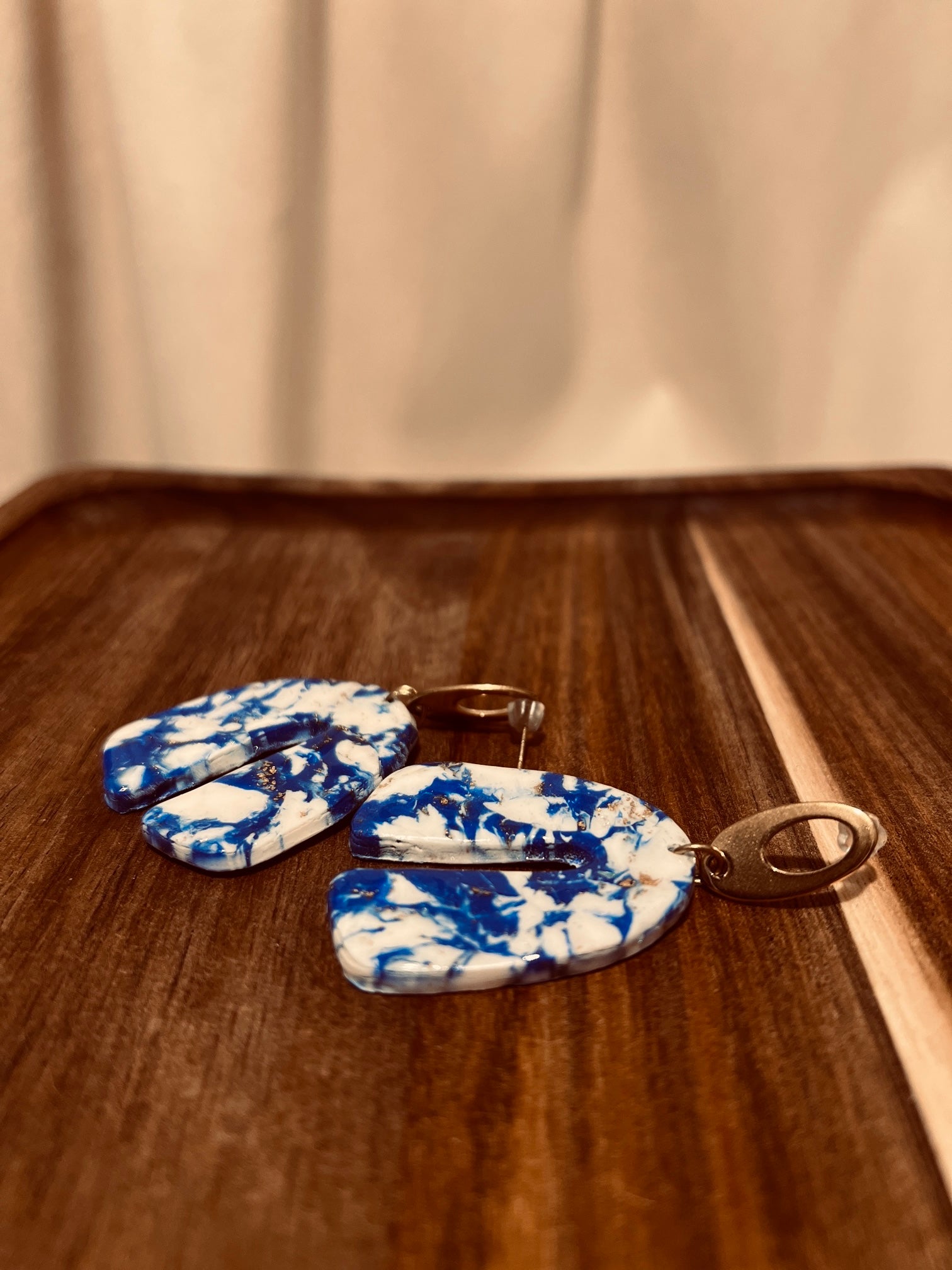 Statement earrings handcrafted from clay, featuring a bold marbled pattern in cobalt blue and white. Lightweight and eye-catching, they add a sculptural touch to any outfit.